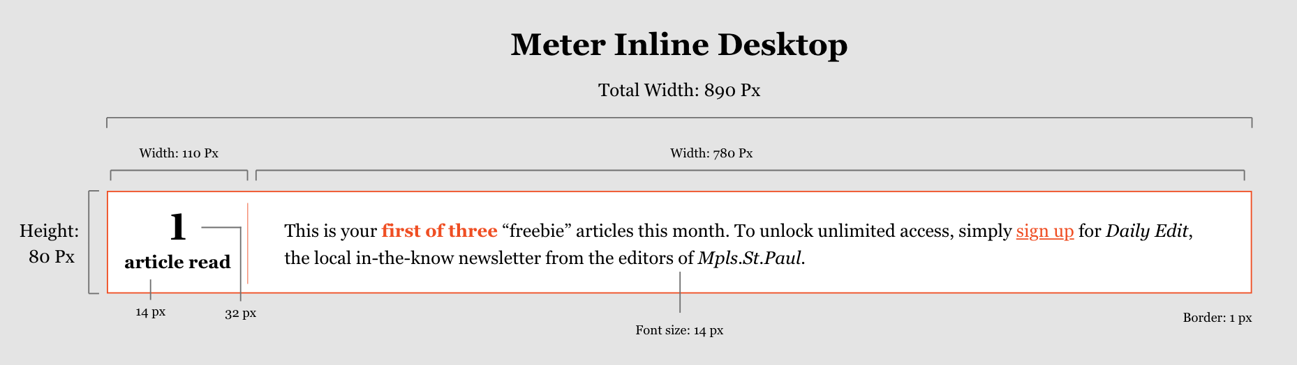The styling of the meter and gate widgets needed to walk a fine line - they had to be noticeable enough to not be ignored, but not so loud as to be annoying or intrusive. After several iterations, the final styling incorporated the signature orange color of the site into just enough elements to make the widgets pop. In addition, the copy for the widgets was written to be light-hearted with classic Minnesota-isms like “Ope!” included to soften the language.