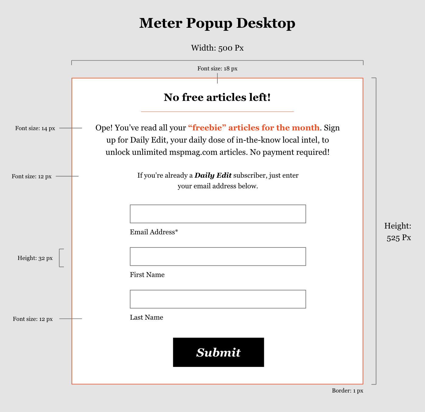 The user flows for each system were relatively simple: the meter widgets included a link to the subscription signup page, and the gating widgets included a direct signup form. Error messages for the popups were handled dynamically, and a “success” popup message would be presented to the user without the lightbox effect to let them know they had successfully subscribed to the Daily Edit newsletter.